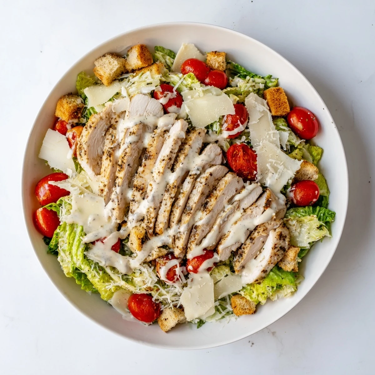 - Arrange the salad on plates, top with sliced chicken and Parmesan shavings, then drizzle the remaining dressing over everything.