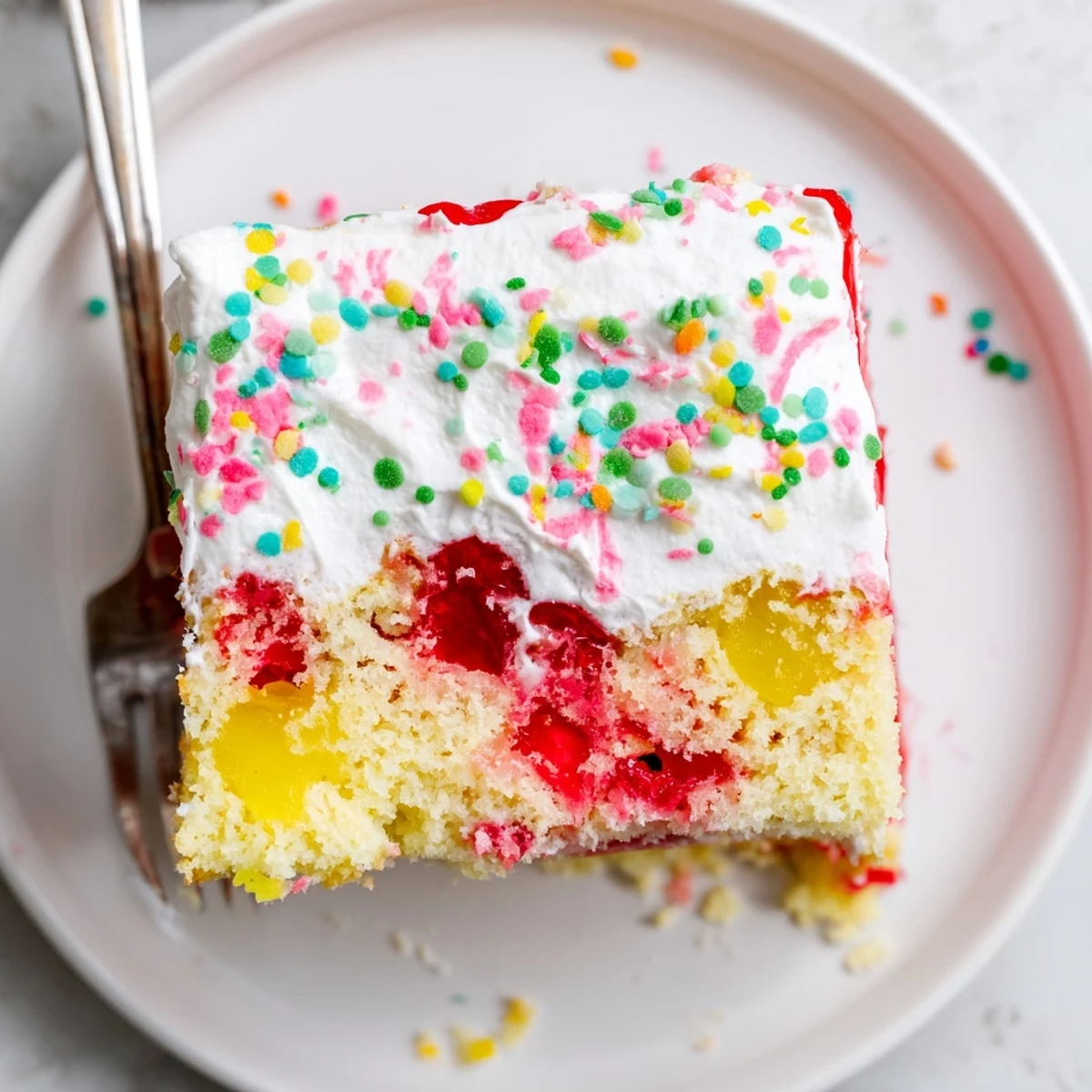 This vibrant Easter dessert transforms a simple vanilla cake into something spectacular. After baking, the tender cake is dotted with dozens of holes, then saturated with alternating pools of strawberry and lemon gelatin. As the gelatin sets, it creates beautiful jewel-toned pockets throughout every slice. A generous layer of freshly whipped cream sweetened with vanilla and powdered sugar crowns the creation, while pastel sprinkles add festive flair. The result is a cool, creamy, refreshingly fruity treat that's perfect for spring entertaining.