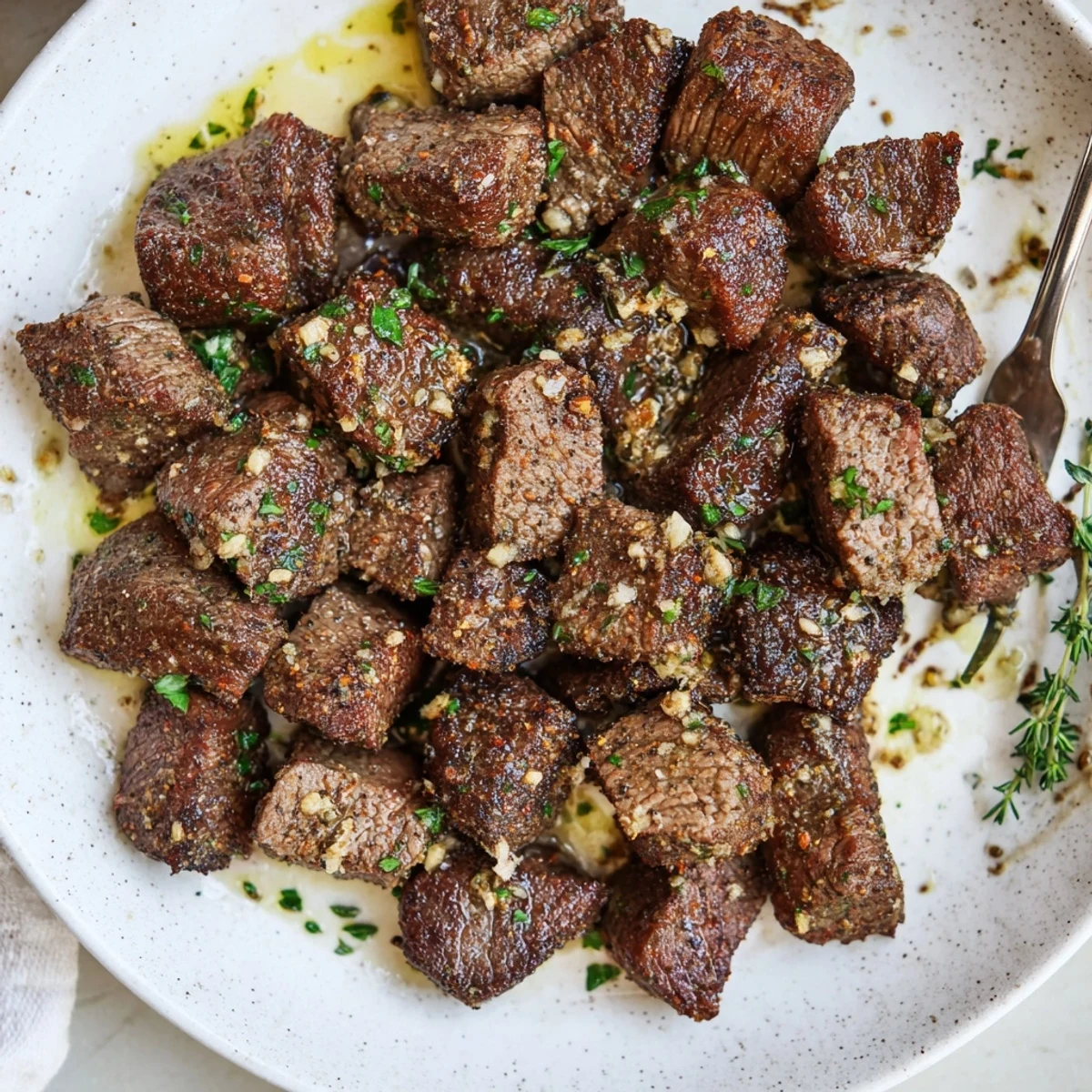 - Return all steak bites to the pan, tossing gently to coat in the glossy garlic butter; sprinkle in parsley and thyme.