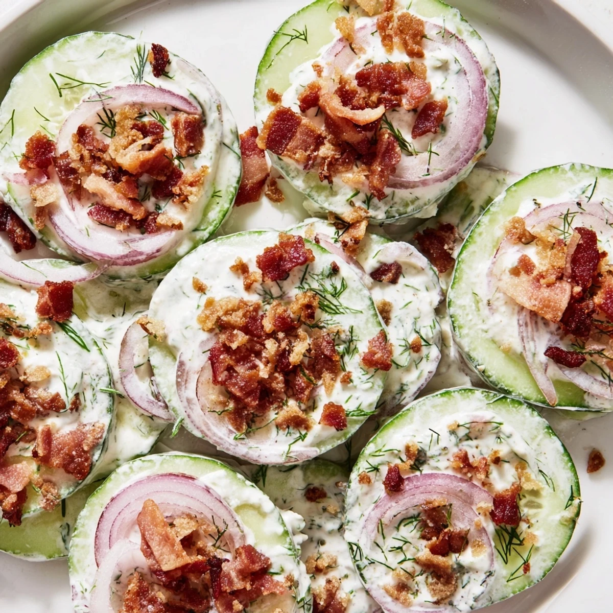 This vibrant salad combines thinly sliced cucumbers with crisp crumbled bacon, creating a perfect balance of cool and smoky flavors. The tangy yogurt-based dressing with apple cider vinegar and Dijon mustard ties everything together beautifully.