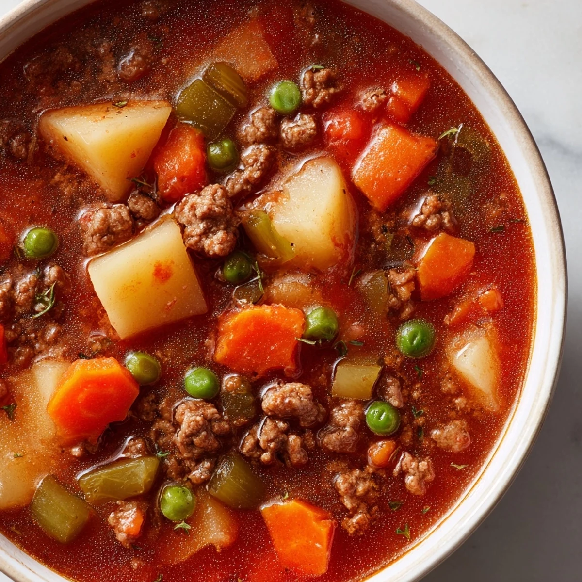 This hearty soup combines browned ground beef with tender chunks of russet potato, diced carrots, celery, and onions in a flavorful beef broth base. The dried thyme and smoked paprika add depth, while frozen peas bring sweetness and color. Ready in under an hour, this filling one-pot meal is perfect for chilly evenings and serves a family of six. Garnish with fresh parsley or shredded cheddar if desired.