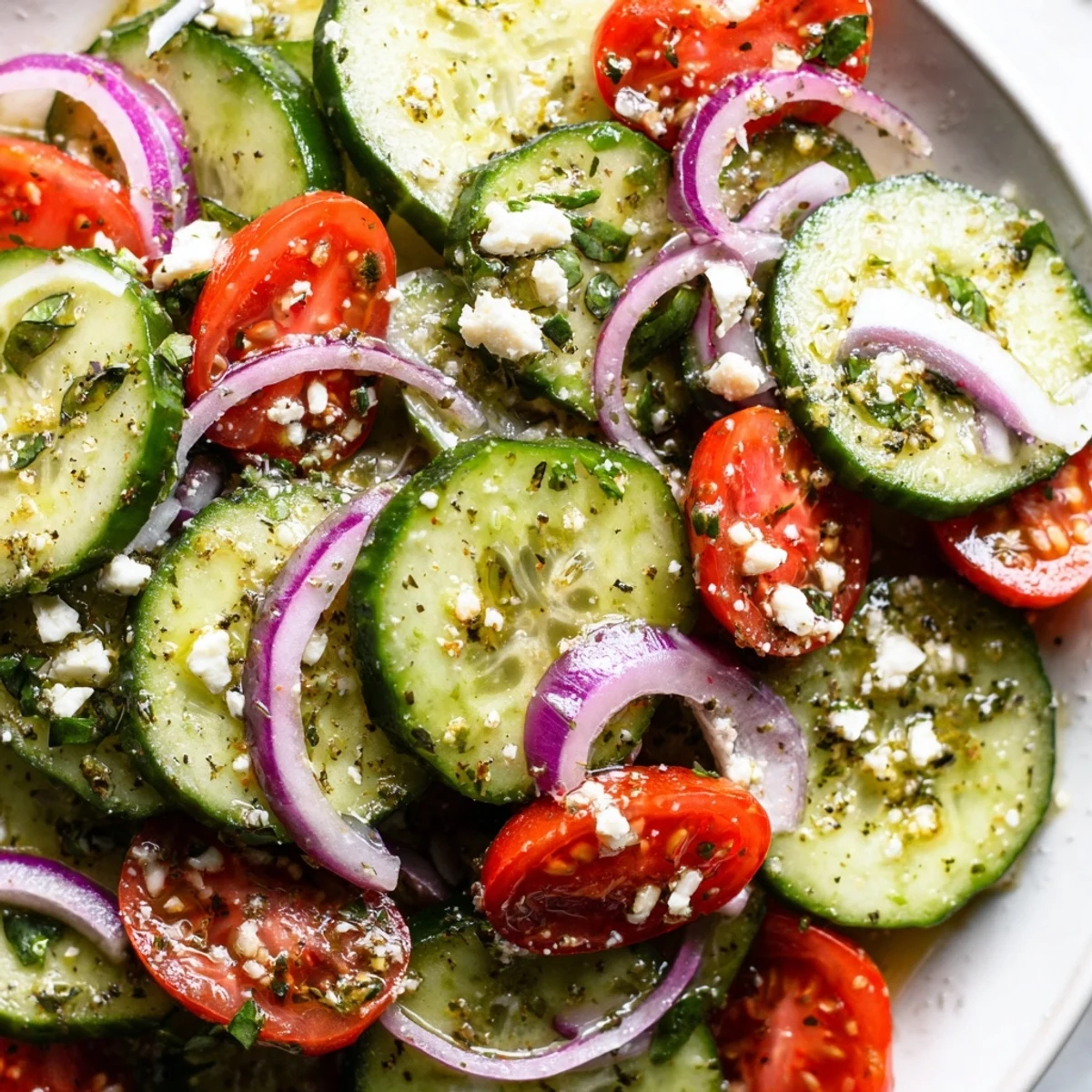 This refreshing dish combines crisp cucumbers, juicy tomatoes, and thinly sliced red onions with a bright, zesty dressing. The olive oil and red wine vinegar blend creates an authentic Italian flavor profile that perfectly complements the fresh vegetables. After a brief 10-minute rest, the flavors meld beautifully into a light and vibrant side dish. Optional feta cheese adds a creamy, tangy finish while keeping preparation quick and simple.