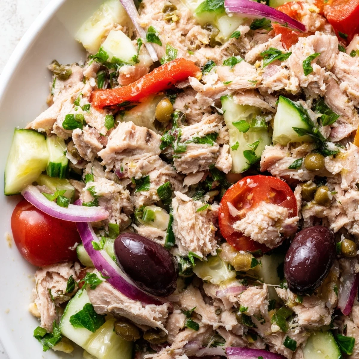 This vibrant Mediterranean-style tuna salad combines protein-rich tuna with crisp vegetables like cherry tomatoes, cucumber, and red onion. Kalamata olives, capers, and roasted red peppers add briny depth, while fresh parsley brings herbaceous brightness. The zesty lemon-olive oil dressing ties everything together with minced garlic and dried oregano.