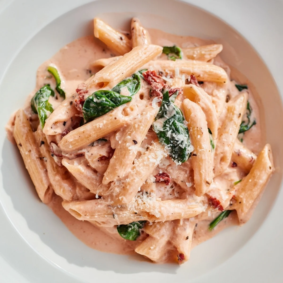This one-pan pasta combines sun-dried tomatoes, fresh spinach, and a velvety cream sauce that clings beautifully to every noodle. The entire dish cooks together in a single skillet, allowing the pasta to absorb flavors while simmering in vegetable broth before being finished with cream and Parmesan. Ready in just 30 minutes, this Italian-inspired main serves four and requires minimal cleanup. Perfect for busy weeknights when you want something comforting and satisfying without spending hours at the stove.