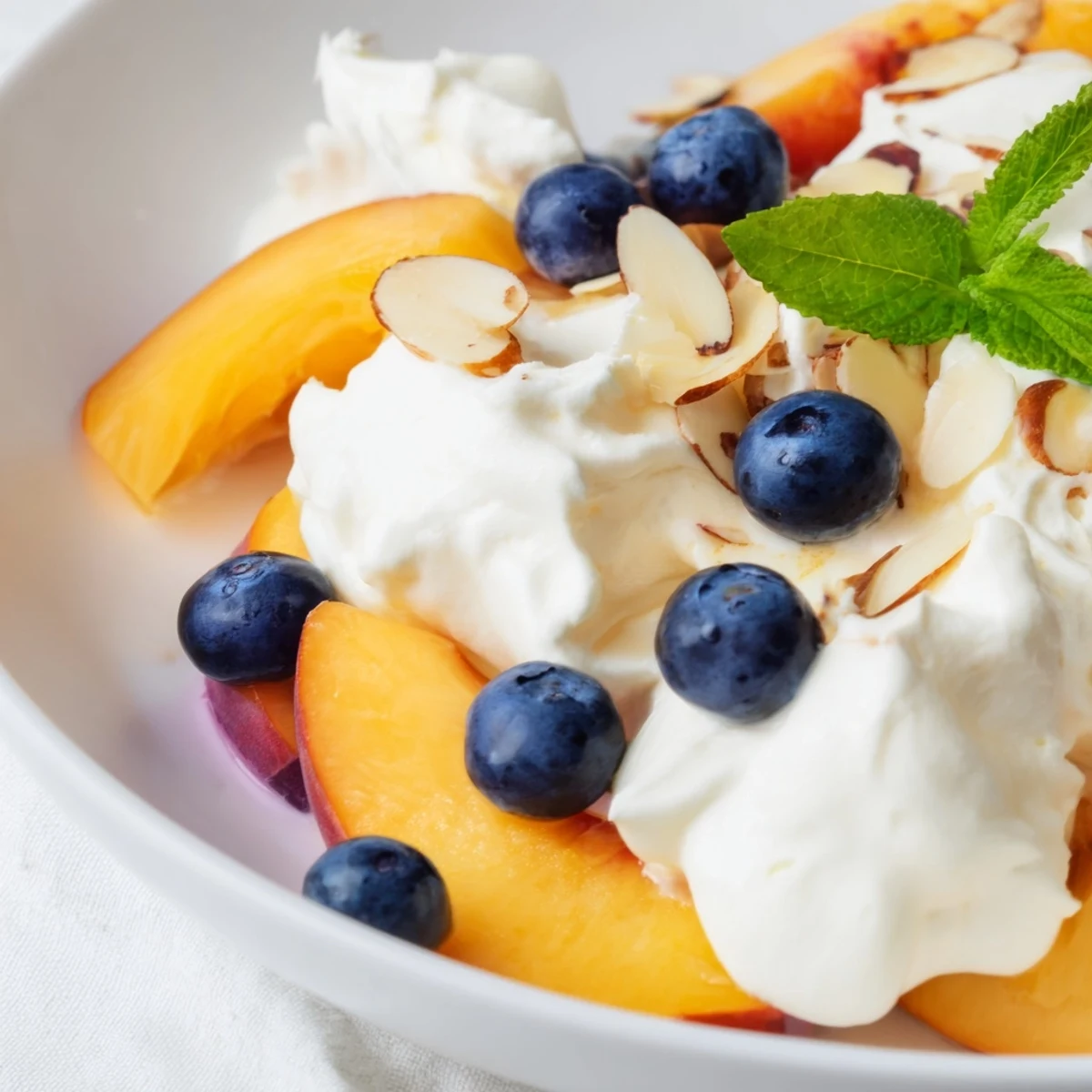 This refreshing summer dessert combines ripe, juicy peaches with light vanilla whipped cream for a simple yet elegant treat. The chilled fruit pairs beautifully with the sweetened cream, creating a balanced dessert that feels indulgent without being heavy. Fresh mint adds brightness, while optional almonds provide satisfying crunch. Perfect for barbecues, picnics, or afternoon refreshment on hot days.